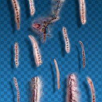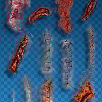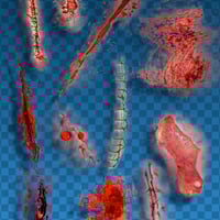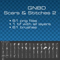 GNBD Scars & Stitches II is a set of 61 png files, plus 1 tif with all layers and 61 brushes for Photoshop and above, which includes scars, stitches, blood, wounds, marks, etc.