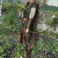 The set includes 11 garments and accessories: arrow, quiver, coat, belt, boots, glove left, glove right, pants, shirt, vest and bow. The coat has a bone structure that allows great mobility and versatility. The weapon visibility is handled by material settings.