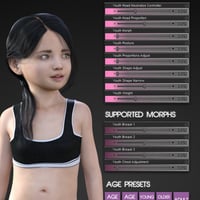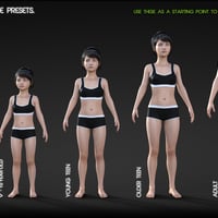The morphs were created based on average human proportions and scale relative to age, so more accurate results could be achieved. Use the age presets, or simply create your own youth character by combining the morphs. Also included is a new head neutralize morph so you can blend in your favorite character faces with more control.