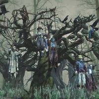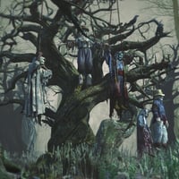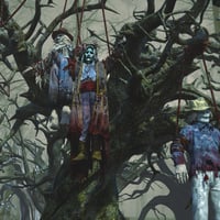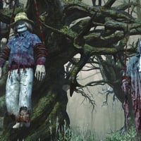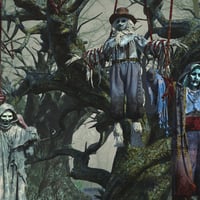 Beneath a blood-colored sky, the twisted silhouette of a massive dead tree loomed over the barren field like a monument to forgotten horrors. From its highest limb swung a rotting scarecrow, its stitched mouth frozen in a silent scream. Tattered clothing fluttered in the dry wind, revealing glimpses of something not entirely straw beneath, something charred, clawed, and wrong. The earth below was cracked and blackened, as if cursed by every soul ever reaped beneath that tree. This was no guardian of crops. This was the final warning; the Harvest of the Damned had already begun.
