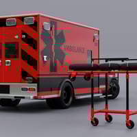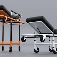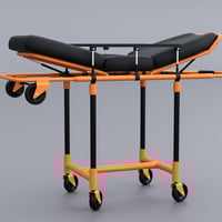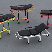 It has a stretcher with rigged wheels, casters, side rails, adjustable backrest and footrest, and a height-adjustable frame.