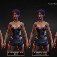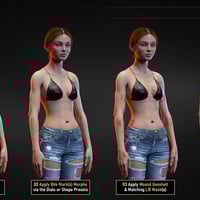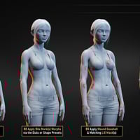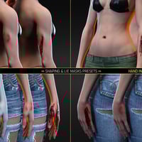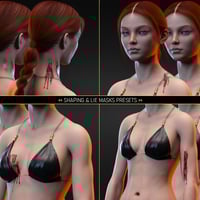 The pack consists of 4 geoshell wearables, 5 material presets, 22 HD body morphs (11 unique morphs and 11 mirrors), 23 shaping presets, 44 LIE mask presets, and 9 partial material presets for further customization. The product works with both Genesis 8 and 8.1* Females.