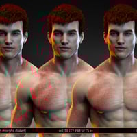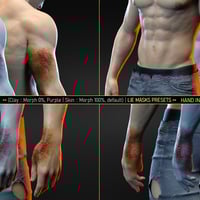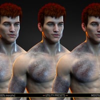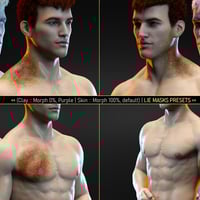 The pack consists of 2 Geoshell Wearables, 6 Material Presets, 20 LIE Mask Presets (two of the morphs are unsupported - Neck Base Left and Neck Right), and 9 partial material presets for further customization. The product works with both Genesis 8 and 8.1* Males.