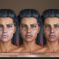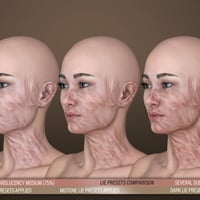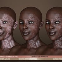 And because we know characters come in all colors, we have included three sets of 34 LIE Iray Material Presets each (Light, Midtone, and Dark) to ensure a good blend with the underlying skin. In total, you get 102 LIE Iray Material Presets with the ability to mix, match, and even stack them for even greater variation and intensity!