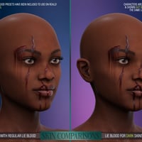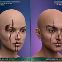 "HD FACE WOUNDS for Genesis 3 & 8 Female(s)" is a collection of 10 open facial wounds created through the careful combination of HD morphs and LIE material presets for flesh texturing and optional blood layering. Included is a mirror option for nine wounds, totaling 19 HD Morphs, 19 Wounds LIE Preset and 38 Blood LIE Presets per generation (19 extra Blood LIE Presets have been included for use on dark skin characters)!