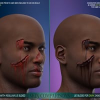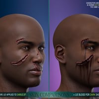 "HD FACE WOUNDS for Genesis 3 & 8 Male(s)" is a collection of 10 open facial wounds created through the careful combination of HD morphs and LIE material presets for flesh texturing and optional blood layering. Included is a mirror option for nine wounds, totaling 19 HD Morphs, 19 Wounds LIE Preset and 38 Blood LIE Presets per generation (19 extra Blood LIE Presets have been included for use on dark skin characters)!