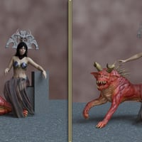 Unleash the power of darkness with this menacing pose pack designed for a fearsome demon dog and a commanding demoness.