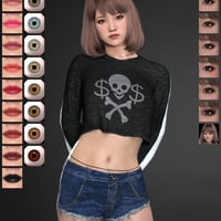 She is optimized for Daz Iray PBR Skin shader with 10 lip colors, 7 face options with and without brows, and 9 eye colors.