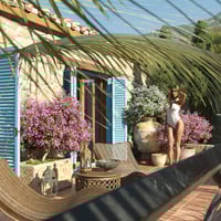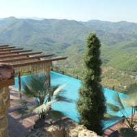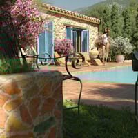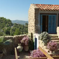 Here is the rustic retreat in the hills with old world charm...with weathered stone walls, rustic wooden shutters, terracotta roof tiles, boho style sun shade with rope covers, private pool and bouganvillea trees.