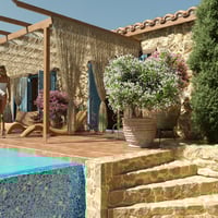 Product is designed for middle scale architectural structures in vignette style, ideal for human scale renders. It has 5 base Hill Side Villa Blocks Presets and Starter Presets for Infinite Pool Terrace, Roof and Boho Style Sun Shade.