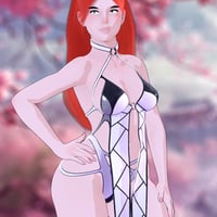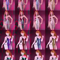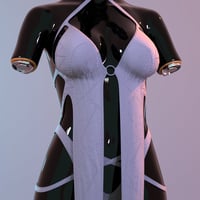 - Accessories: Black choker with a metal ring, reinforcing the futuristic and sexy look.