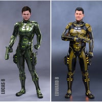 Hydron Suit for Genesis 8 Male(s) is the next sci-fi suit from Midnight_stories. It's a hard surface suit with support for 9 shapes and more. There's a full body suit, boots, gloves, and helmet. Plus left and right hand guns with matching holster. There's a massive set of materials, 14 in all, with car paint shaders, worn metal paint and rubber, so there's something for everyone and there's Hierarchical material Presets, so it's a one click operation to apply. The helmet has 4 glass presets. And 7 light color presets for all clothing. There are Hierarchical pose Presets for the gun for both Genesis 8 Male and The Brute 8. And a bonus Balaclava mask for free. This is one of the best valued sets out there. Great for all your sci-fi scenes. There is also a matching set for Genesis 8 female.