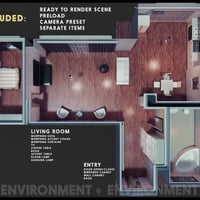 This is a cute apartment collection for Daz Studio, including a unique layout with bedroom, bathroom, kitchen, living room, entryway and large windows. Morphing sofa, chairs, bed and curtains included. Ready to render scene, preload, and camera presets also included.