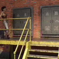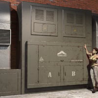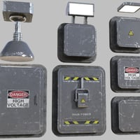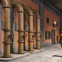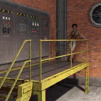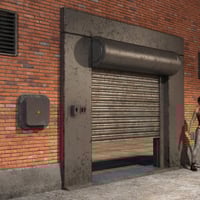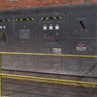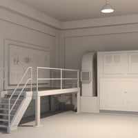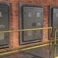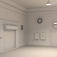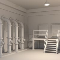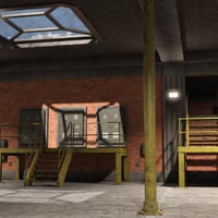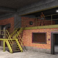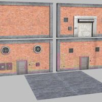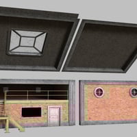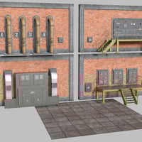 Industrial themed modular interior kit with 10 walls, 2 floors, 2 ceilings, 1 support post, 3 light fixtures and 5 electrical boxes. Walls include movable doors/fans and hide-able parts. One pre-built interior is included.