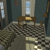 The room has 3 doors and 3 double sash windows with curtains (all posable), a walk-in closet with shelves and coat-hooks, an alcove with shelves, a tiled floor, radiator, plenty of switches and sockets, and two lampshades.