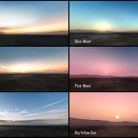 This set includes 6 render presets for Iray. All presets use 12K pixels images in HDR format which provide background showing nice sunsets through hazy atmosphere in a desert with mountains on the horizon.
