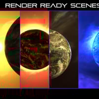 The HDRI selection contains multiple nebulas of varying color and cloud densities, along with a simple star background. The planets are made up of multiple layers, including a base material, Atmosphere, Emission, clouds and a rotatable rim-light that allows you to highlight the planet without powerful accompanying lights. Multiple 2d effect layers are included to react with the scene lighting and provide ambiance. A simple SSS atmosphere dome is available, allowing for simple fog effects.