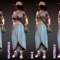 This outfit consists of a two-piece bikini, a t-shirt tied to the side, a summer pareo skirt compatible with dForce System, and wicker accessories with four different texture sets. All clothes have built-in HD Morphs to add extra detail.