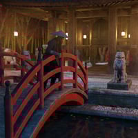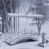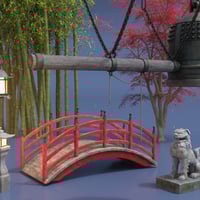 This highly-detailed scene includes a traditional Japanese bell housed in a decorative gazebo. It sits in an environment that includes bridges, a moat, steep, rocky ground, Acer trees, a bamboo forest, dog statues, hanging metal lanterns, and free-standing stone lanterns.