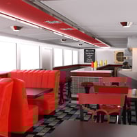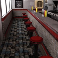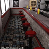 Diner model includes a Microwave and Fridge and full Kitchen area. The seating area has tables as part of the model, but the seating are props so you can speed up render time when not in use. Kitchen area includes Fryer area, Sink area, Griddle area, and an overhead extractor.