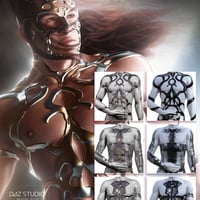 3 designs - organic shapes for a Sci-Fi Bio-Suit, shapes directly on skin that appear to be wired communication sensors, interface modules or like a protecting cage against rays of any kind. All this in 18 fascinating metallic color variations for rendering in DAZ Studio 3Delight and NVidia Iray.