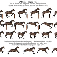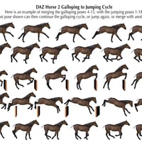 This series includes basic action-cycles for Walking, Trotting, Cantering, Galloping, and Jumping horses. Each set is also designed to merge with others by transiting from certain key-frames. The horse can go from standing to walking to galloping (trotting and cantering) to jumping. It's a unique presentation of motion poses. There is a lot of latitude for customizing the poses and the combinations.