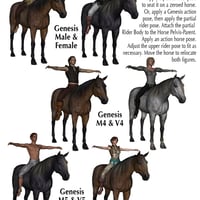 Partial poses to seat riders on a zeroed horse are included for Genesis Basic Male and Female, Genesis V4 and M4, and Genesis V5 and M5. As partial poses they can seat your other Genesis poses on the horse.