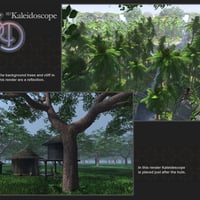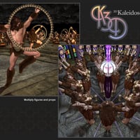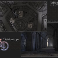 How can it be used? Render dazzling faceted images just as with a traditional Kaleidoscope and go further to create infinite drops, tunnels, streets, and hallways with depth! Even though your scene inside Kaleidoscope may be small, haze cameras (not included) continue to build up atmosphere as the reflections multiply. You can choose what reflects and what doesn’t, you can multiply a whole forest of trees and have only a single figure exploring it all. Choose the depth (amount) of reflection as you have the ability to create a small group of fighters up to a massive army, a small town up to a mega-city, a small grove up to an immense wilderness. And since these props are reflections and not actual geometry they will render faster than if you had loaded dozens of figures. Kaleidoscope also features the ability to turn three walled sets into full 360° environments and enlarge smaller rooms significantly.