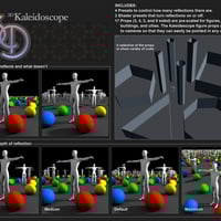 Kaleidoscope is a collection of mirrored props, with a variety of sides and angles, that multiply scene objects to create beautiful patterns and expansive scenes. Go beyond the limits of real Kaleidoscopes by putting figures, objects and whole environments inside the prop!