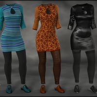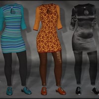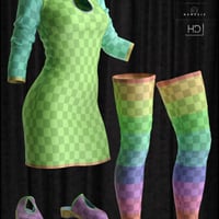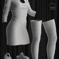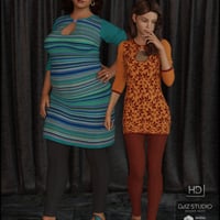 Three separate clothing figures: Dress (with button), footless stockings, and shoes. The dress follows the thigh bends and has many adjustment morphs, it also has options to make it shorter or longer if desired or give it a subtle flare. Two different wrinkle morphs, one being HD, and separate trim and seam-line HD morphs that you can mix and match to your taste. It also has 3 different breast span morphs to aid in more realistically fitting unsupported characters. The stockings are not full trousers, they go up to the very top of the thighs. They also have many morphs including wrinkles, trim, and several boot fits. The top and bottom trim morphs are separate so if you're using them under other clothing you don't have to worry about poke-through, or you can zero all the style morphs and have smooth tights. The shoes have quite a few adjustment morphs but you'll probably never need them. The UVs and material zones are arranged for fantastic results when using shader presets, especially horizontal stripes. Both 3Delight (Uber surface) and Iray (Iray Uber) materials are included. Other than the blue and orange dresses all others options use grey scale textures and may be re-tinted to taste. The base mesh is medium weight and the HD morphs are built on Sub-D level 2 so they won't bog down your system. There are two complete set loading options, one is full HD (Sub-D 2) and the other uses Sub-D level 1 for if you have a much older system or are rendering many frames and need it to be as fast as possible.