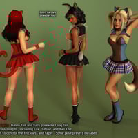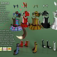 Kibri Dress for Genesis 2 Female(s) is an anime inspired outfit, representing the spirit and fun of animals. The outfit consists of a one-piece bodice, a double layered short skirt, a short vest or jacket, boots, collar piece, wrist bands, geografted animal tails and animal ears. the animals represented are a bunny, a cat, a bear, and a fox.
