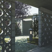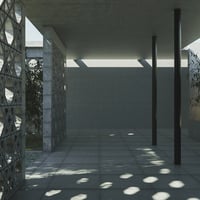 The concrete pergola-style building features intricate decorative block inlays, creating a visually appealing design.