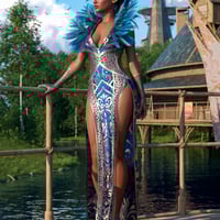 Her outfit is made with the feathers of her faithful squire the raven, a long dress with fur, gloves, stockings, and an embroidered shoe in 4 colors.