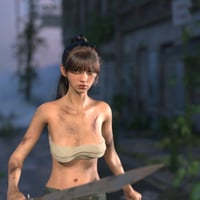 Yang, a female character for Genesis 9.This is a character model of a post-apocalyptic East Asian female survivor, embodying both toughness and a gentle spirit. The package contains two material texture sets: 'Base' and 'Battle-Damaged'. The Battle-Damaged set includes high-fidelity skin textures with detailed, sculpted scarring.