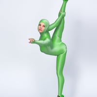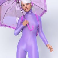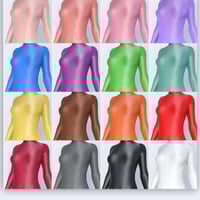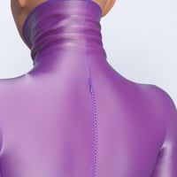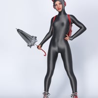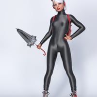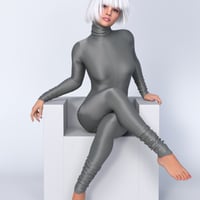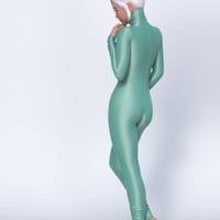 Spandex Suit 02 - is a full-body tight suit (jumpsuit, catsuit). 100% spandex, back zipped, with long sleeves and a high close-fitting collar (turtle neck). Sleeves, legs, and collar are pulled up and gathered in pleats.