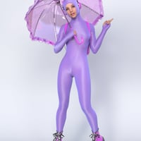 Spandex Suit 01 - is a full-body tight suit (jumpsuit, catsuit), including the feet. 100% spandex, back zipped, with long sleeves and a high close-fitting collar that is used as a hood.
