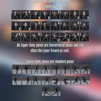 For each of the supported figures there are 21 full body poses with 21 mirrored poses. There is included 21 upper and lower body poses with mirrored versions of each for pose mixing. In addition to this, there is 4 left and right hand poses so that the laser sword can be used with any Genesis 3 or 8 pose set. The lower body poses are standard poses while all the full body, upper body and hand poses are hierarchical poses. This means that the laser sword will be correctly placed in the figures hand when using the hierarchical poses, as long as it is parented to the correct hand first!