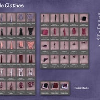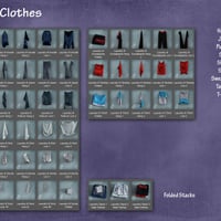This mega pack contains ten female clothing items and nine male clothing items, each in four hanging shapes and one folded shape, plus a bucket full of clothing, a dryer with clothes and clothespins and six stacks of folded clothing. The presets for the full bucket, the full dryer and the stacks are groupings of separate items, so you can move and edit each item to your liking.