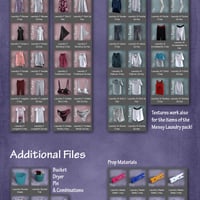 The items and textures are clearly labeled with M and F for male and female items, and the thumbnails are color-coded, so you'll know easily which texture works for which item.The textures of this set are fully compatible with my Messy Laundry Mega Set, so you can mix and match the textures.