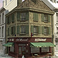 European style bistrot. Comes with a medium detail interior, two smart propped awnings, two tables a chair and a stool. All shutters and doors are posable.