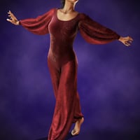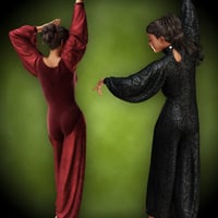 This dynamic pantsuit combines oriental flair with western style. Soft flowing folds, billowing sleeves, and stylish textures with printed velvet and rhinestone-studded silk.