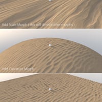 This high-polygon quad-based mesh resembles a layer of sand to start with but offers morphs and some seamless textures that allow for its transformation into sandy dunes, underwater sand beds, turbulent seas, or even a calm layer of water. Additionally, the package includes three mesh objects designed to replicate splashes and eight preset scenes to jumpstart your creativity.....the only limitation is, that it's based on camera angles, not infinite I'm afraid.