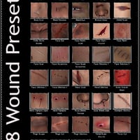 Scars, scabs, scratches, stitches, bruises, bullet holes, cuts, gashes, and even vampire puncture marks are now instantly available in DAZ Studio. This Wound Pack for the Layered Image Editor provides a “one click” way for DAZ Studio users to expand their rendering possibilities. The pack contains 38 injury presets that work on the head, body and limbs of all Generation 4 characters – male and female. Simply click the chosen wound onto your character and the injury will blend onto the texture. These presets work with Victoria 4, Aiko 4, the Girl 4, Michael 4, Hiro 4, or The FREAK 4 - and with any future G4 bases around the same mesh.