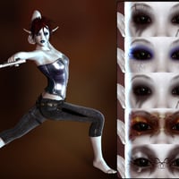 This package comes fully stocked with five makeup options, four eye choices, two nail options, and the options to use either the Poser 5 and later shader enhanced textures or DAZ Studio material presets.