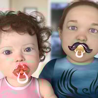 The pacifiers come in two versions: for girls and for boys. The decoration of the girl's pacifier can be enlarged and morphed into big lips and the decoration of the boy's pacifier can be enlarged and morphed into a big mustache. Other morphs to change the position of the ring and to reduce or enlarge the size of the pacifier, guard, ring and teat are also included.