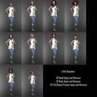Little Beauties for G8F is a fantastic pack with 10 Head and 10 Bodies Custom and 10 full Shapes Presets, witn Apply and REM files for easy use.