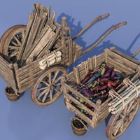It comes in several versions — one is loaded with barrels, another with wagon parts, there are various rockets in the rear of one, and the final is transporting cabbages. Also included are stored tools, a wooden bucket, bundles of wood, bedrolls, and a strewn blanket in the rear.