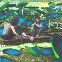 At the first light of dawn, two young men glide silently across an ethereal lake draped in a veil of mist. Like poets in search of inspiration, they are lotus flower pickers, their skillful hands gently brushing against the delicate petals with infinite tenderness. The flat-bottomed Asian boat glides gracefully on the calm water, leaving a silver wake among the floating water lilies. The lake is a vegetal Eden, where lotus leaves unfold their emerald hues, caressed by the dew, offering their rare beauty to the first rays of the sun. In this enchanted tableau, the young men weave an eternal connection with nature, in harmony with the splendor of the awakening world.