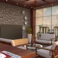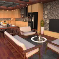 Featuring stone accent walls, rich wood finishes, and a spacious open layout, this interior offers the perfect setting for cozy dinners, elegant gatherings, or high-end lifestyle scenes.