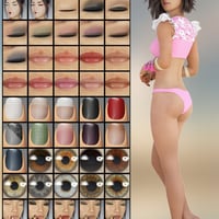 Kumiko has 8 makeups, eye colors, lipsticks, and 9 nail polishes and all-in-one presets. There are buttons for Anatomical Elements Materials, an alternative torso with no anatomical details for risque clothing, a LIE no Eyebrow setting, and a No Eyebrow Face option are included. To make her look special, custom morphed fingernails and eyelashes are included.